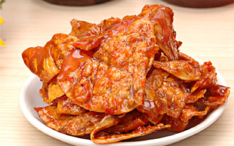 Mực rim me là món ăn vặt được rất nhiều người yêu thích. Mực khô sau khi nướng hoặc chiên sẽ được rim cùng nước sốt me, đường, gừng và ớt tạo nên hương vị đậm đà.